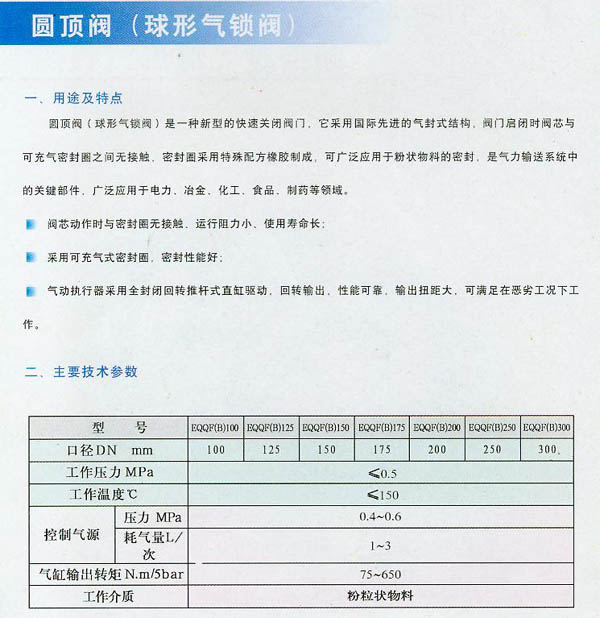 圓頂閥(球形氣鎖閥)是一種新型的快速關(guān)閉閥門,它采用國際先進(jìn)的氣封式結(jié)構(gòu),閥門啟用時閥芯與可充氣密封圈之間無接觸,密封圈采用特殊配方橡膠制成,可廣泛應(yīng)用于粉狀物料的密封,是氣力輸送系統(tǒng)中的關(guān)鍵部件,廣泛應(yīng)用于電力,冶金,化工,食品,制藥等領(lǐng)域。